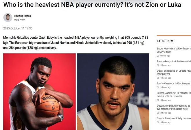 NBA球员体重排名:杨瀚森122公斤第九,扎克·埃迪居首